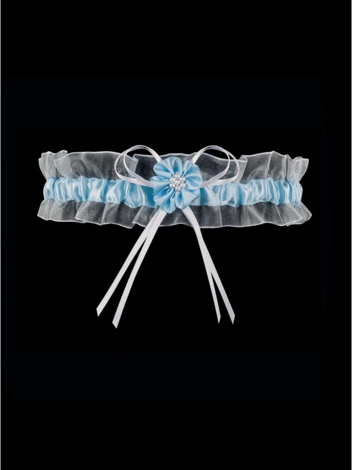 Elegantní podvazek z jemného šifonu a saténové stužky. Zdobený mašličkou a květem.