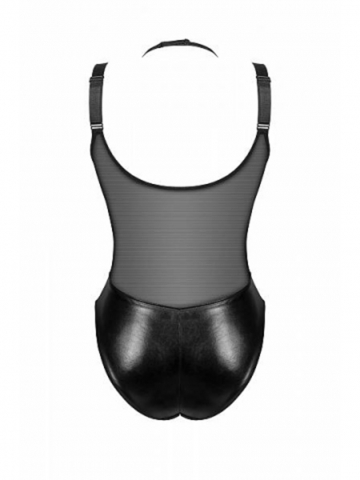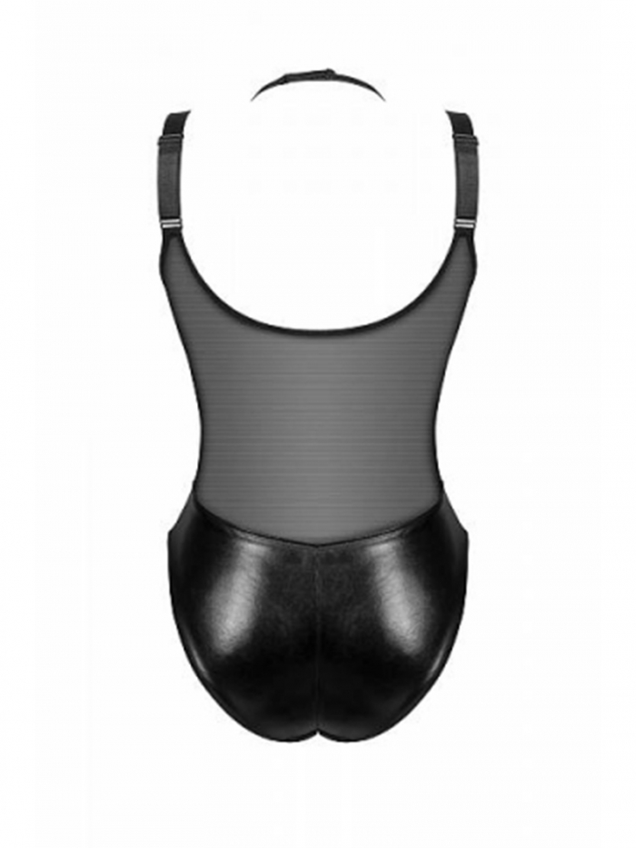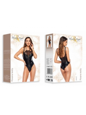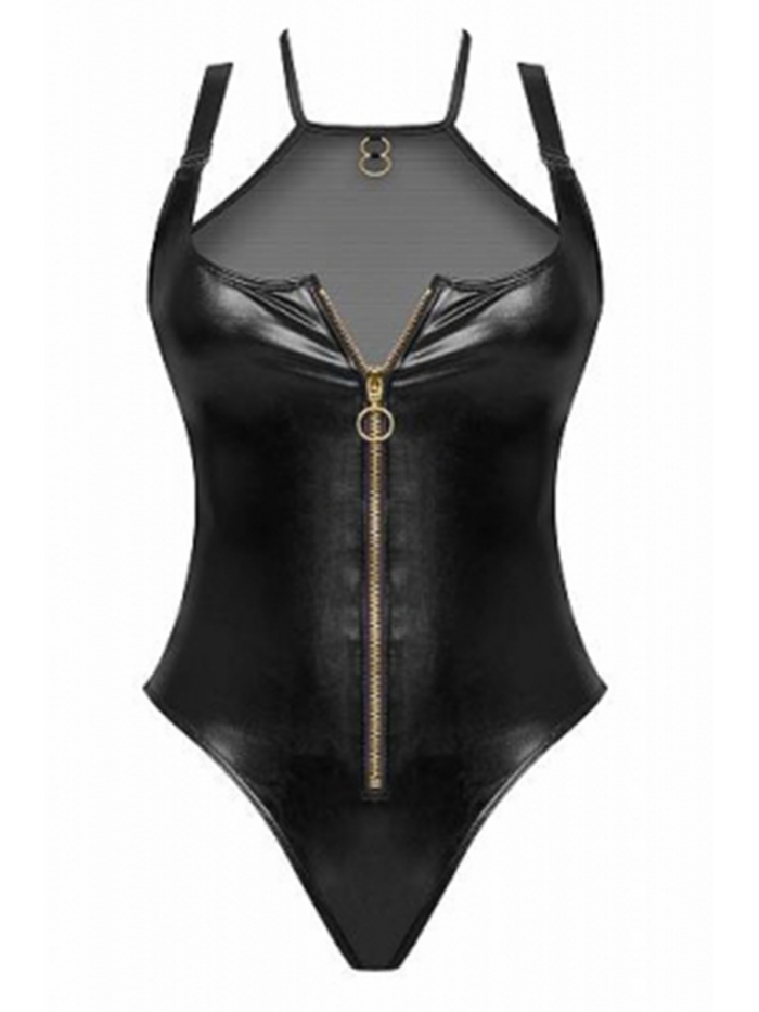 Body Roxana je kombinací tylu a lakovaného lesklého materiálu, který zajišťuje smyslný vzhled a dokonalé přizpůsobení. Díky zapínání na háčky v rozkroku lze body nosit také jako top v párty outfitech. Zlaté akcenty v podobě zipu a kroužků u krku dodávají celému modelu eleganci a luxus. Perfektní volba pro večerní vycházky a romantická setkání.