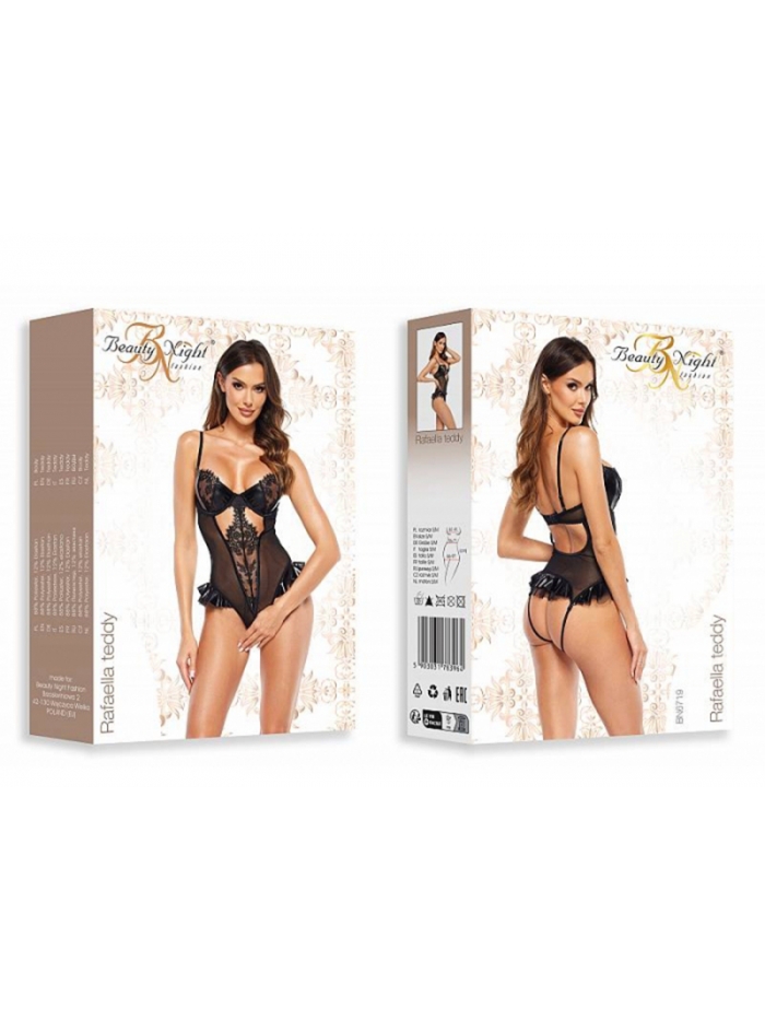 Body Rafaella je okouzlující model, který spojuje eleganci a smyslnost díky kombinaci krajky, tylu a materiálu typu wetlook. Tyto luxusní látky krásně zvýrazňují postavu a dodávají jí sofistikovaný a ženský vzhled. Košíčky zdobené jemnou krajkou decentně odhalují dekolt a vytvářejí svůdný efekt. Otevřený přední díl s krajkovými vsadkami a tylem přidává na rafinovanosti, zatímco zadní část s hravými volánky přináší lehký, koketní detail.