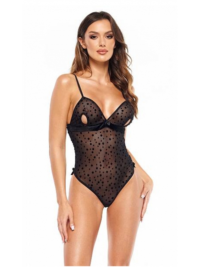 Sexy a zároveň roztomilé body vyrobené z černé síťoviny s puntíky. Smyslné otvory na košíčcích dodávají modelu pikantnost, zatímco pásky na zadečku krásně zdůrazňují jeho křivky. Body má nastavitelná ramínka a praktické zapínání v rozkroku.