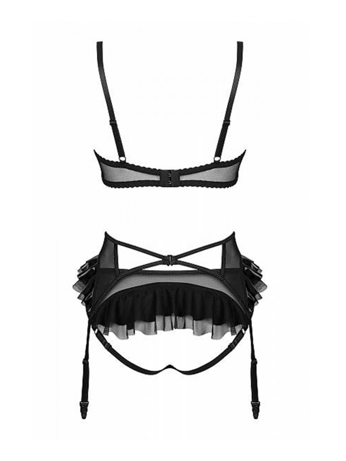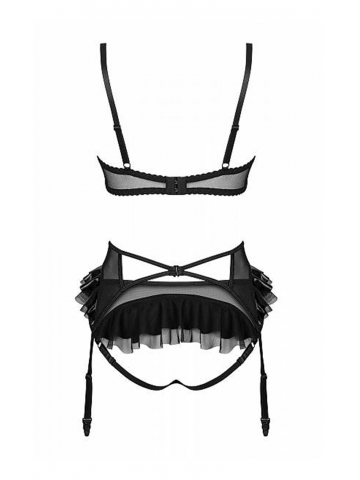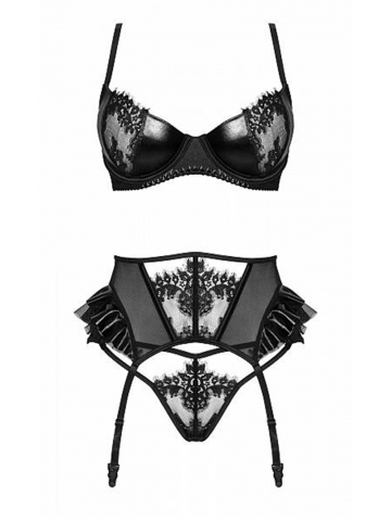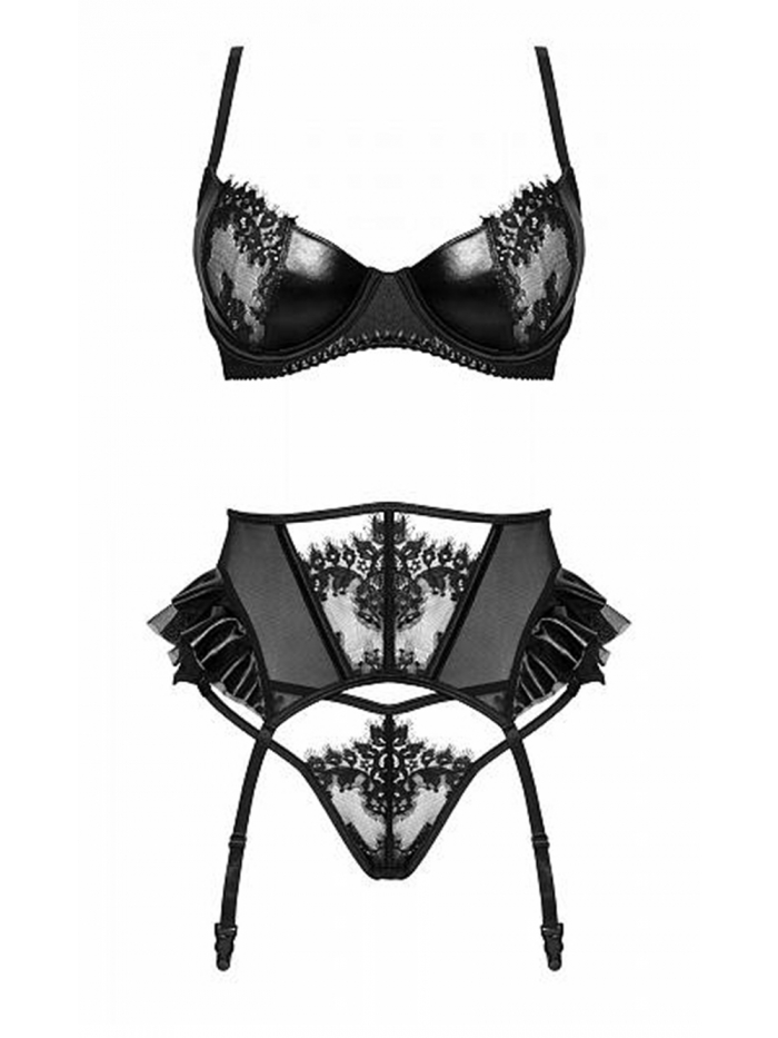 Tento ohromující komplet spodního prádla spojuje eleganci s odvážným, smyslným stylem. Vyrobený z černé krajky, tylu a materiálu typu wetlook, dokonale zvýrazňuje ženské tvary a dodává sebevědomí. Podprsenka s kosticemi a krajkovými košíčky skvěle zdůrazňuje poprsí a zároveň poskytuje pohodlí. Vysoký podvazkový pás s jemnými volánky zvýrazňuje pas a nastavitelné pásky zajišťují perfektní přizpůsobení. Celek doplňují smyslná tanga, která ladí s celou sadou.