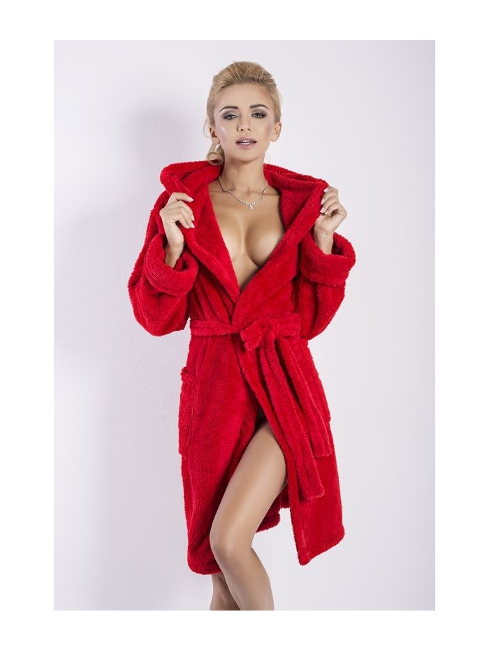 Krátký župan Diana značky Dkaren s kapucí v nádherné červené barvě. Velmi příjemný a jemný materiál na dotek. Župan má po stranách všity dvě kapsy a zavazuje se na pásek přidržovaný poutky. Je vyroben z dlouhého vlasu, který je hebký velmi příjemný na omak. Je hřejivý, pohodlný a rychleschnoucí.