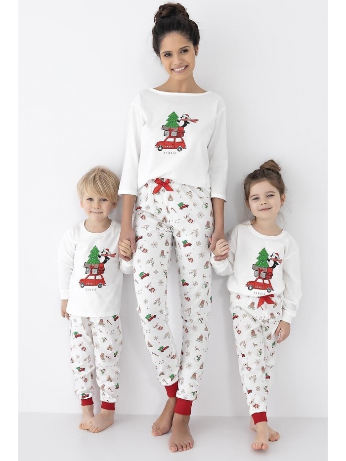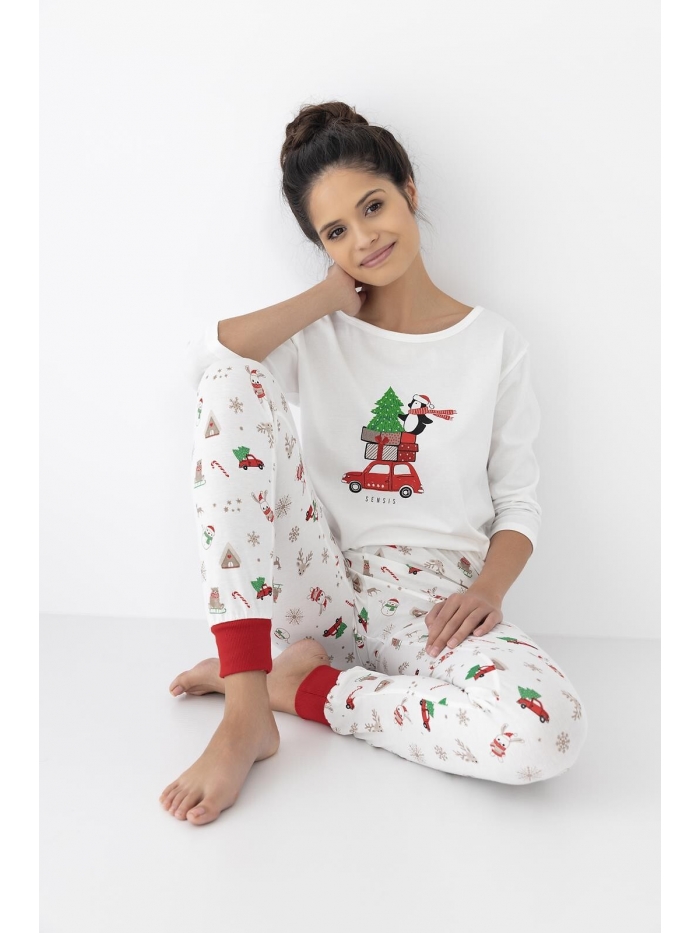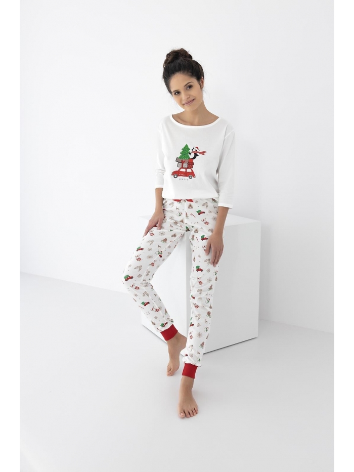 Dámské pyžamo. Vysoce kvalitní bavlna. Tričko s 3/4 rukávem. Ozdobené zimním motivem k tomu vzorované, dlouhé kalhoty. vVpase saténová mašle. Nohavice zakončené pružným lemem.