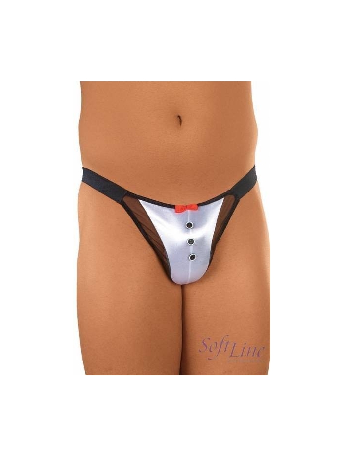 Elegantní tanga pro tvého muže, vše v černo-bílé barvě, zdobené malým červeným motýlkem.