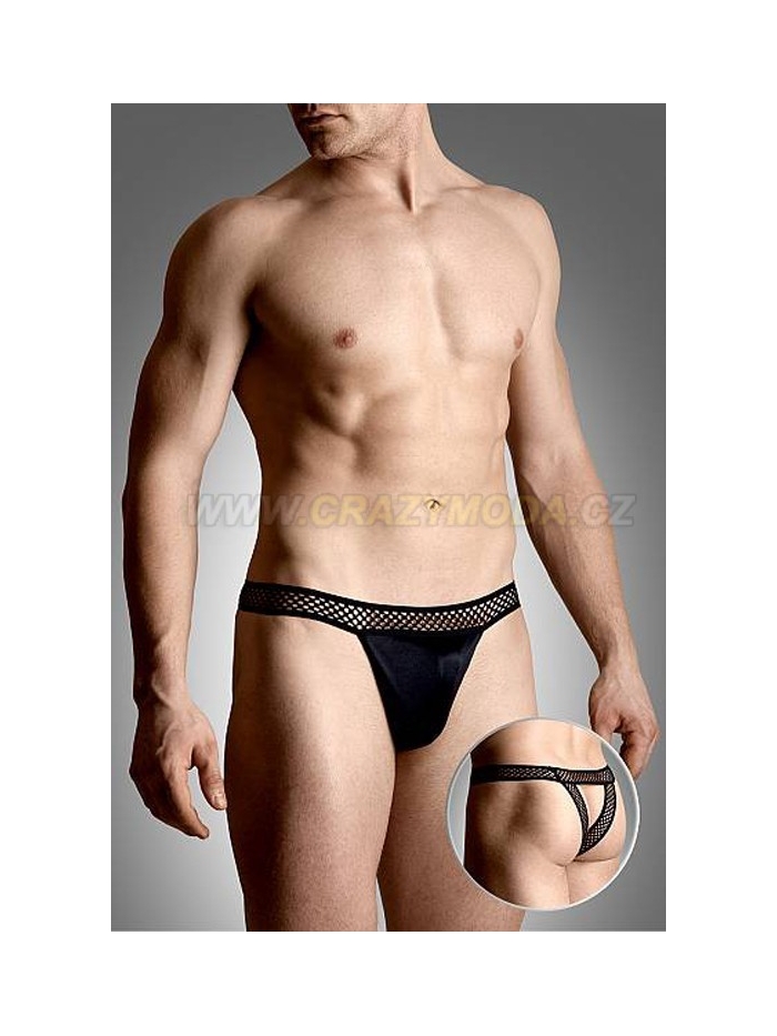 Lákavé pánské jocksy ( tanga ). Vyrobené ze dvou dekorativních gum, které zdobí pánské hyždě. Kapsa na penis je saténová. V černé barvě.