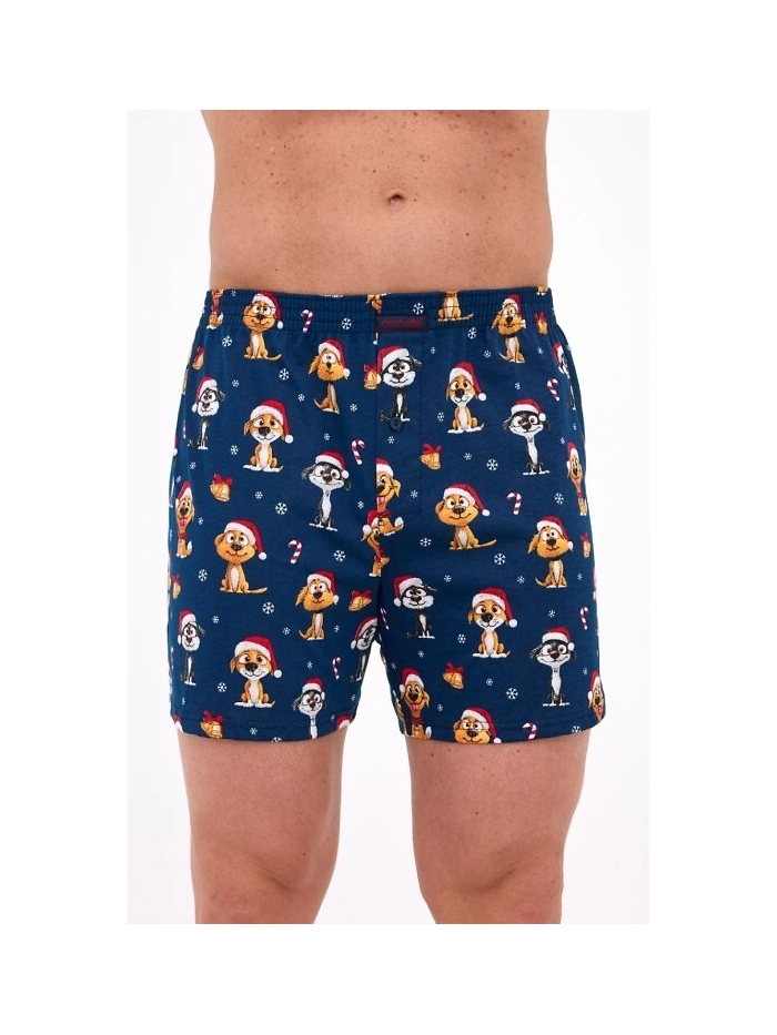 volné pánské boxerky v sytě tmavě modré barvě jsou ozdobeny veselým potiskem vánočních pejsků v čepičkách Santa Clause a s cukrovými hůlkami