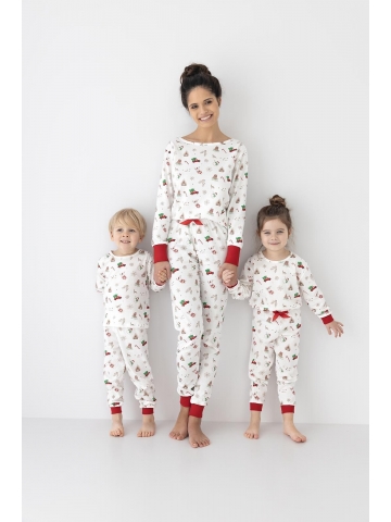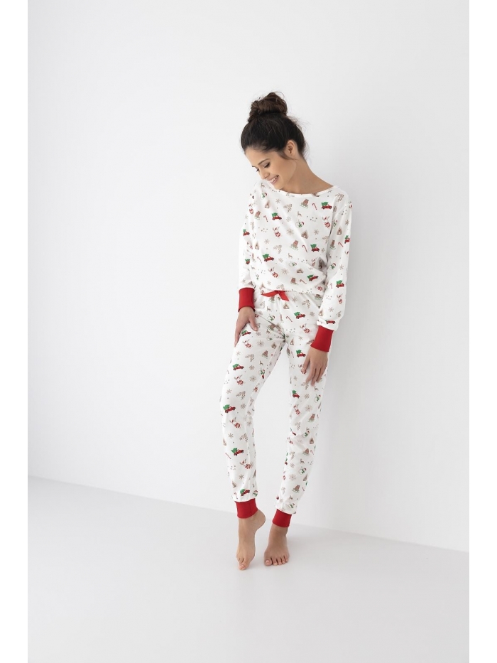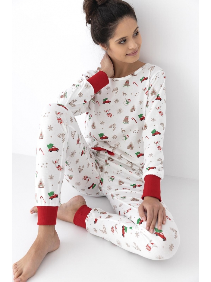 Dámské pyžamo. Vysoce kvalitní bavlna. Zdobené zimním motivem. Tričko s dlouhým rukávem. V sadě dlouhé kalhoty. Saténová mašlička v pase. Manžety a nohavice zakončené pružným lemem.