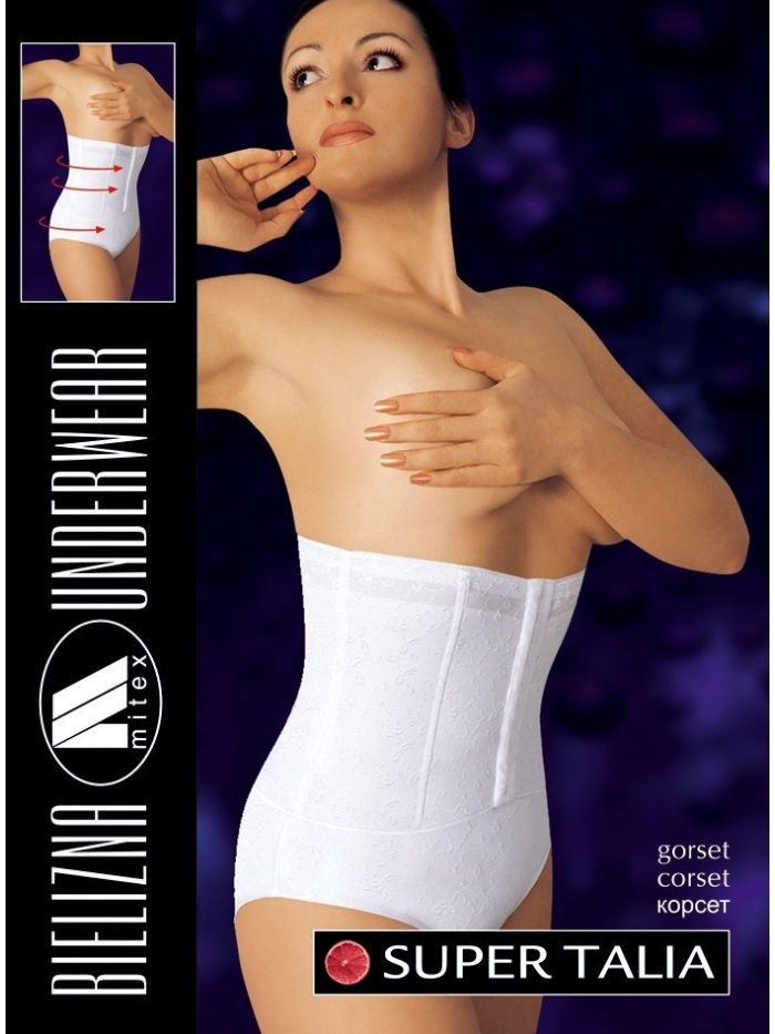 Korzet určený k modelování pasu. Je vyroben z elastického materiálu zdobeného lesklou výšivkou. Pro žádoucí efekt je korzet v místě, kde obepíná břicho, zpevněn elastickým materiálem. Pás se zapíná pomocí osmi háčků a je vyztužen šesti vertikálními výztuhami, které brání deformaci tvaru (shrnování) korzetu. Ve spodní kalhotkové části je korzet vybaven dvoupolohovým zapínáním.