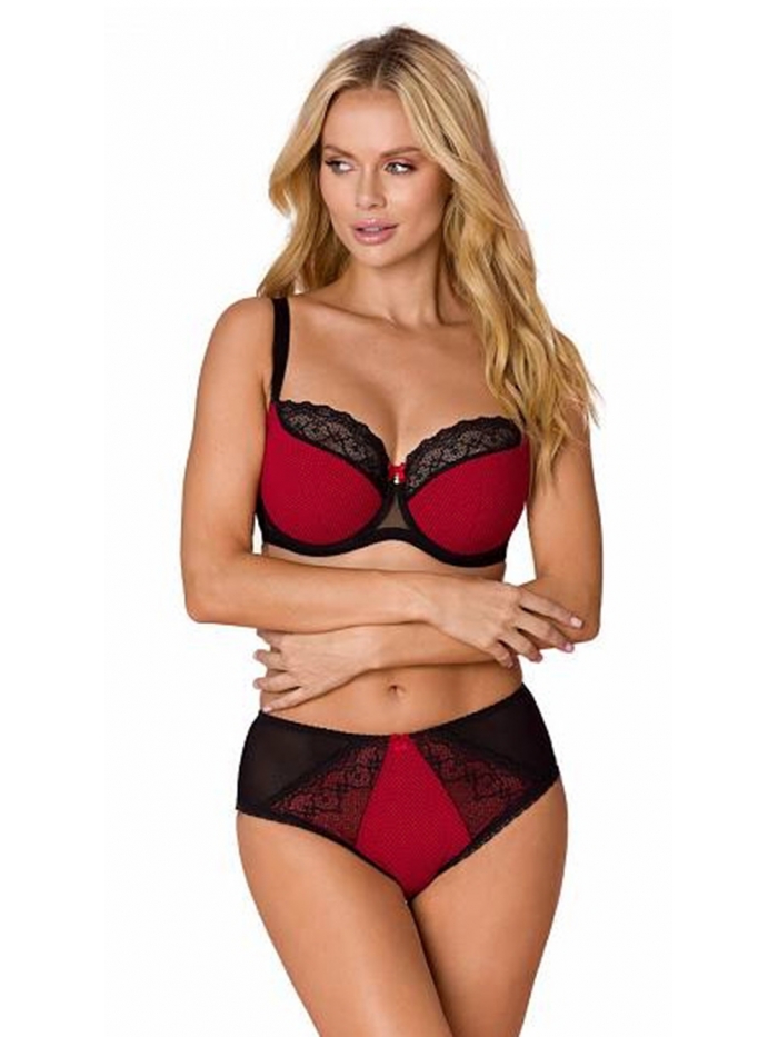Krásná polovyztužená podprsenka na konstrukci K7, která skvěle sbírá a podpírá prsa. Vyrobena z červené látky s puntíky, krajky a pěny v červeno-černé kombinaci. Uprostřed podprsenky je červená mašlička se zlatým ozdobným detailem. Neodepínatelná, nastavitelná ramínka.