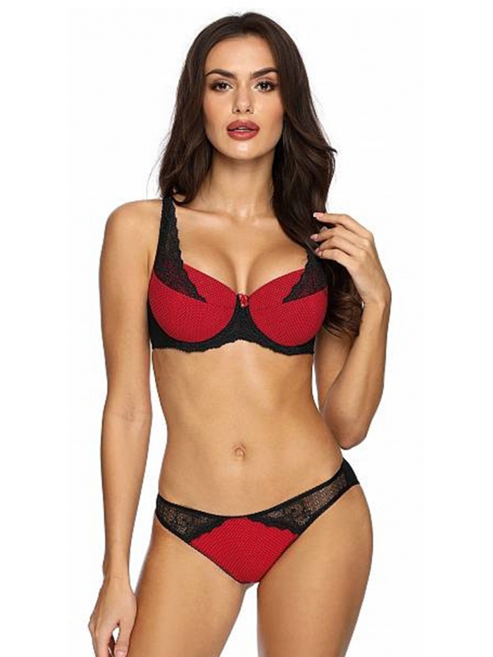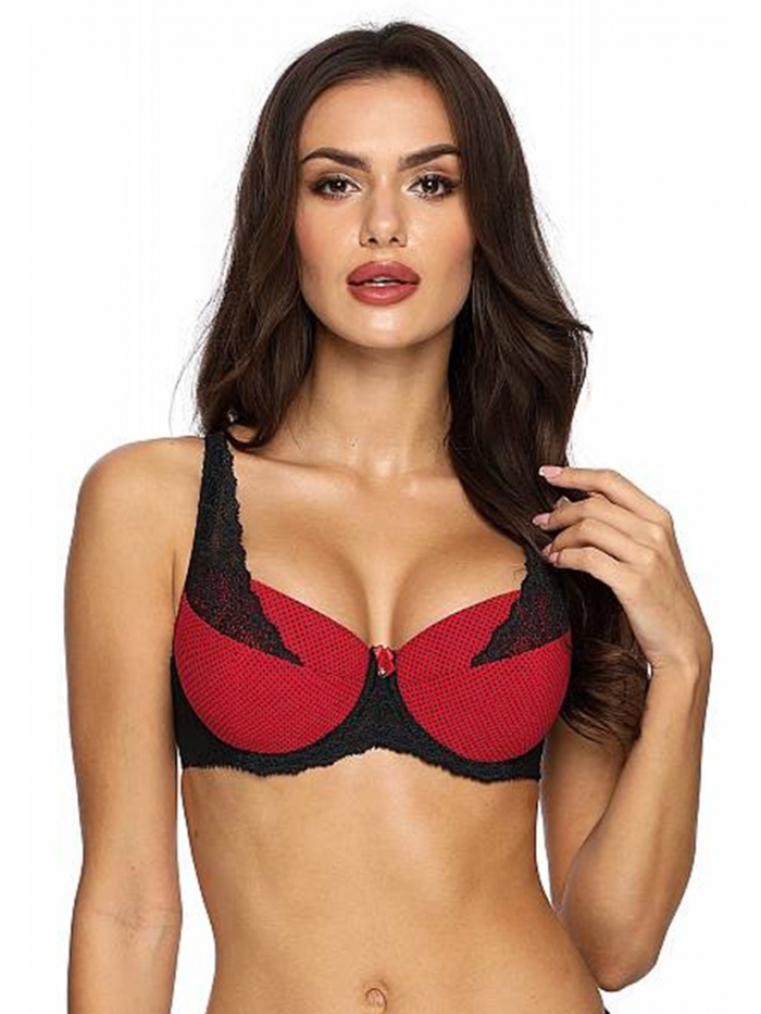 Smyslná push-up podprsenka, navržená pro ženy s menším nebo středním poprsím, byla vyrobena s maximální přesností, aby každá žena mohla nosit tento model s hrdostí a sebevědomím. Tento model kombinuje červený úplet s jemným černým puntíkovým vzorem a elegantní krajkou, která se smyslně táhne podél ramínka. Boky podprsenky jsou z lehkého tylu. Ramínka jsou neodnímatelná a nastavitelná, s vyjímatelnými push-up vycpávkami. Celý model doplňuje jemná červená mašlička se zlatým, lesklým prvkem.
